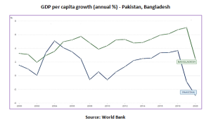 Likewise, only 18% of the labor income goes to women in Pakistan (World Bank, 2020). Moreover, similar statistics for Bangladesh, being the best performer in South Asia, stand at a rate of 38% of women actively participating in the labor force in 2018. Furthermore, it can be noted that the annual GDP per capita growth rate of Bangladesh in 2020 was 1.35% whereas for Pakistan it stood at a rate of -1.44% for the same year (World Bank). This capitulates the stark difference between the economic participation and opportunities available for the women vis à vis the economic growth rate in return of that as can be seen below.