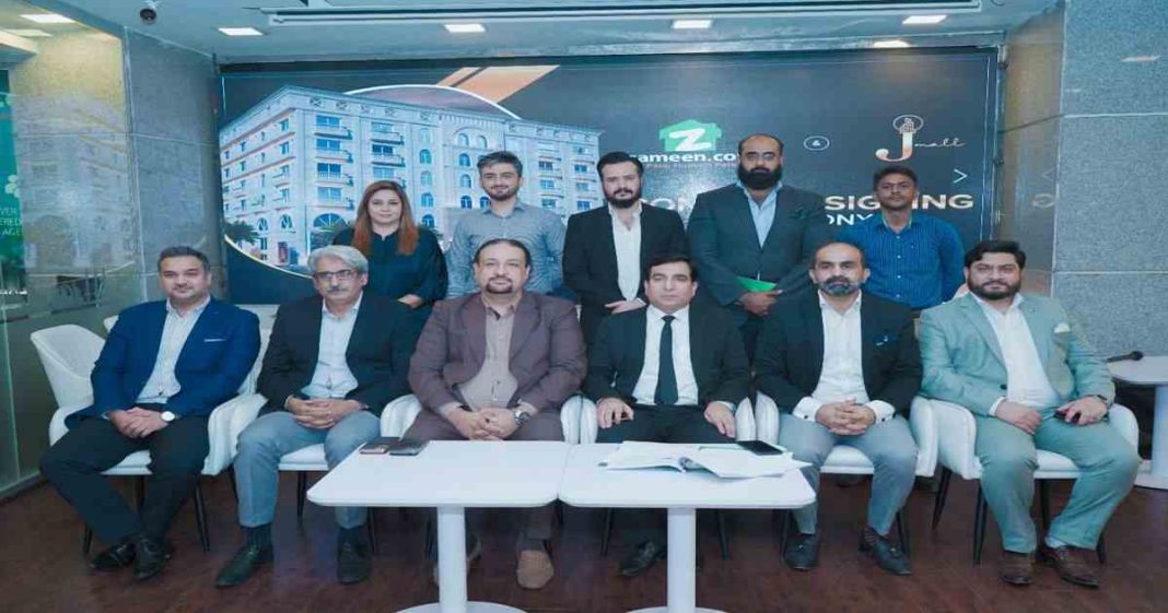 LAHORE: Zameen.com — Pakistan’s largest property enterprise — recently acquired the sales and marketing rights for a vertical real estate project on Raiwind Road – Lahore, called J Mall. In this regard, a signing ceremony was held at Zameen.com’s head office featuring Zameen’s Senior Director Laeeque Chaudhry, Zameen Project Sales Directors Basil Hafeez, Hafiz Usman Sarwar, and Ali Rehan, and Unit Head Project Acquisitions and JVs Mohsin Gulzar. Also present on the occasion was J Mall’s Chairman Mian Jahangir, along with other senior members of his team.